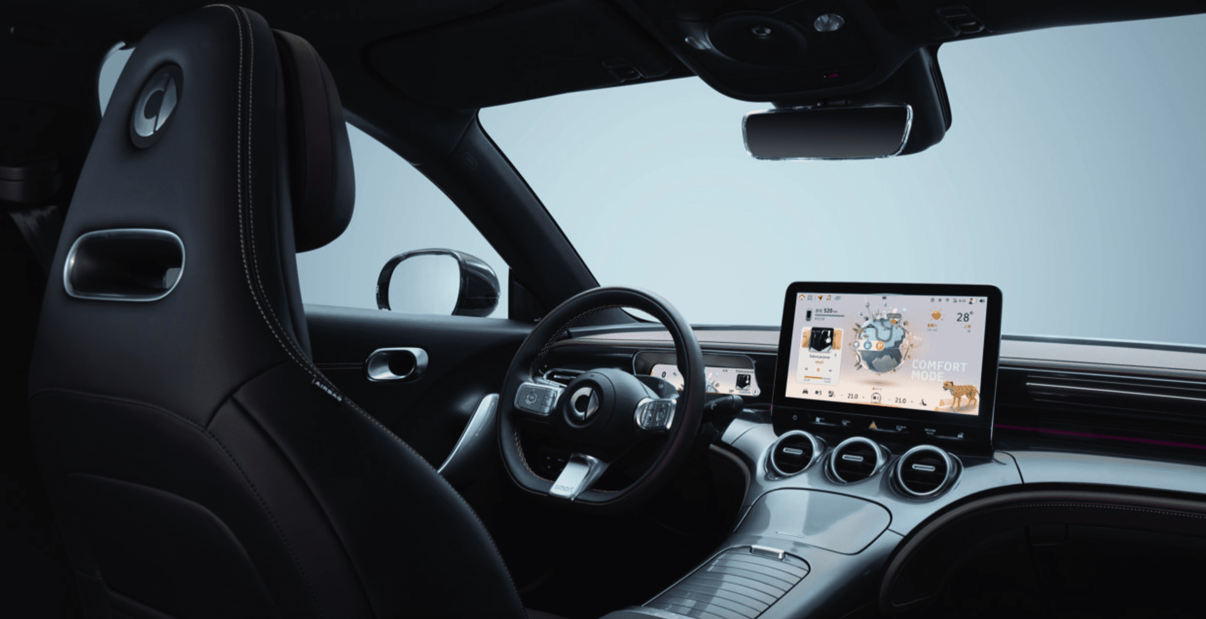 全新smart精灵#3的内饰选用新奢运动座舱,带有头枕的运动座椅增强了整个内饰的运动气氛,辅以雕塑般精美的仪表盘,以及12.8英寸悬浮式中控屏。颜色丰厚的气氛灯、Beats 品牌音响13扬声器,为全新 smart精灵#3动听心潮的“高能座舱”营造出十足的气氛感和典礼感。